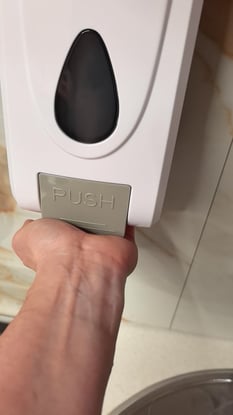 Носик выхода средства находится близко к клавише нажатия. При нажатии мыло попадает не на руку, а стекает по клавише нажатия.