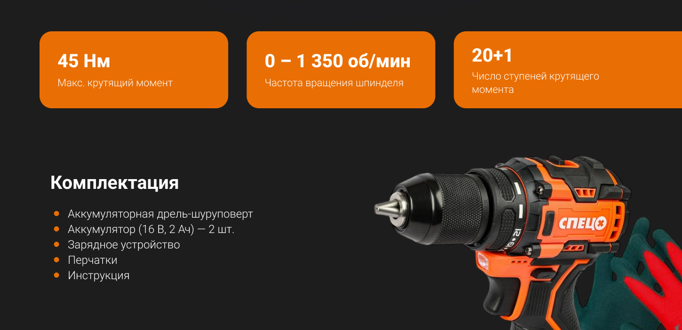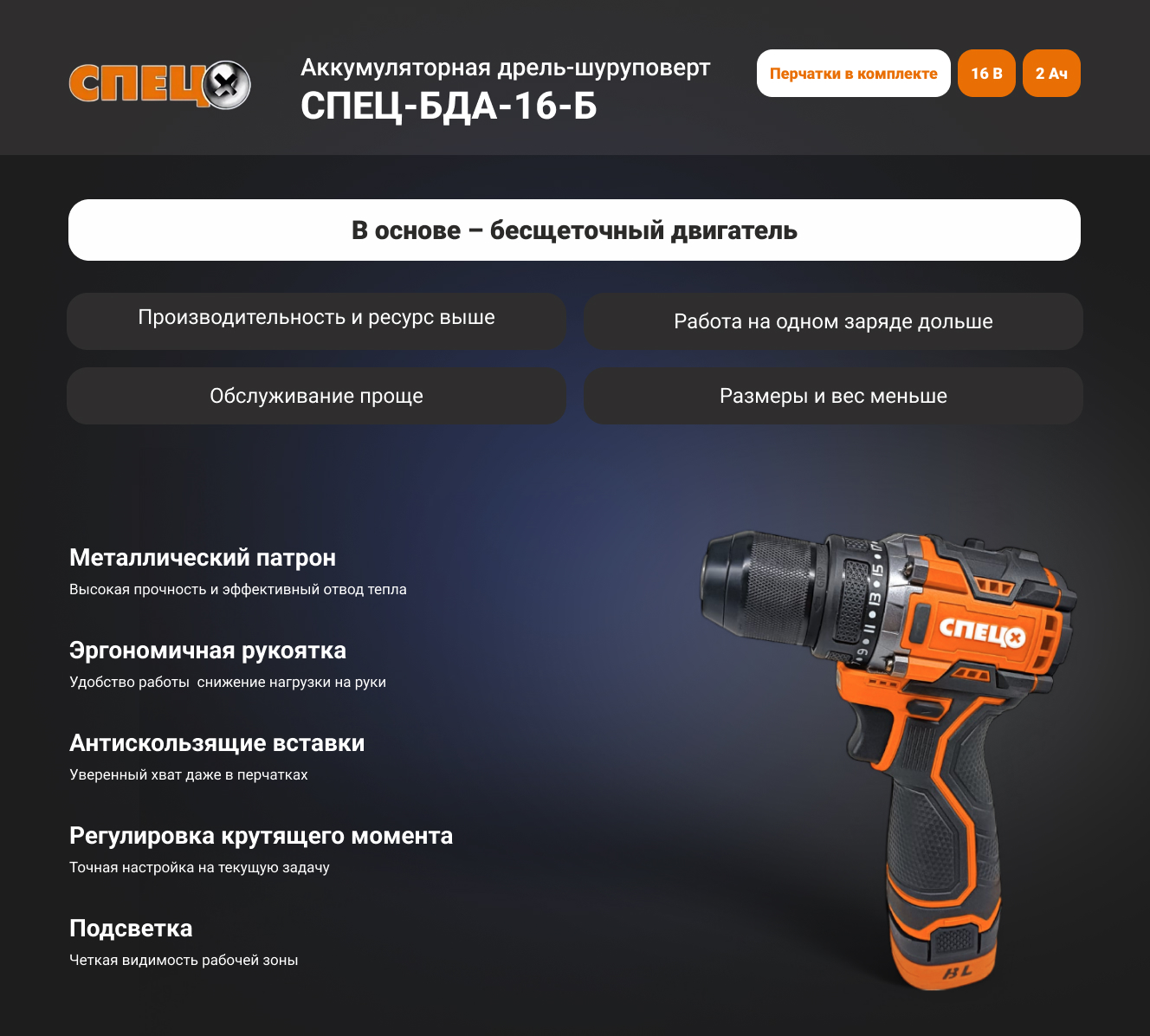 Дрель аккумуляторная Спец БДА-16-Б, (бесщеточный двигатель),16В,2аккум *2,0Ач,металл.патрон 10мм + перчатки СПЕЦ-4129/ВС-136-0272