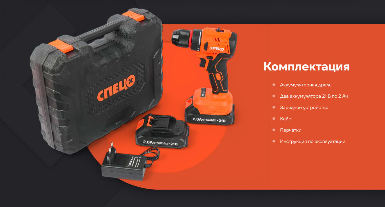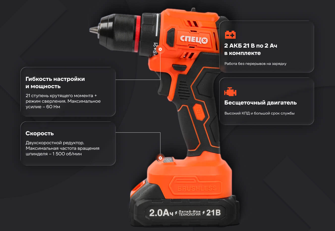 Дрель аккумуляторная Спец БДА-21-Б, (бесщеточный двигатель),21В,2аккум *2,0Ач, Ли-Ион, 0-450/0-1500об/мин,60Нм,реверс,21+1,рег..момента,металл.патрон 10мм,блок.шпинделя,инд.батареи,подсведка,зарядка 4ч,кейс + перчатки СПЕЦ-4131/И-8076-И
