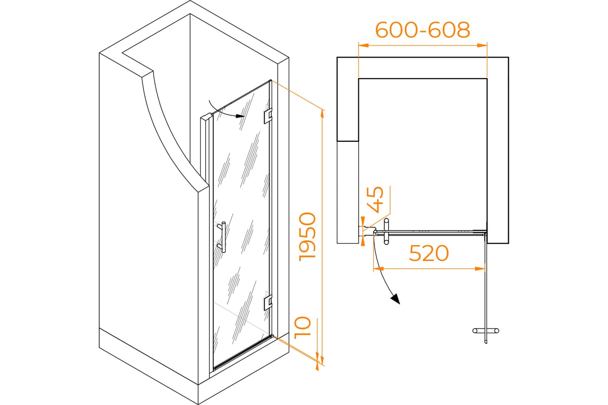 Эта душевая дверь общей высотой 1950 мм подходит для большинства ванных комнат стандартного размера. Имеет 3-й класс герметичности, обеспечивающий надежное закрытие дверцы и предотвращение вытекания воды наружу.