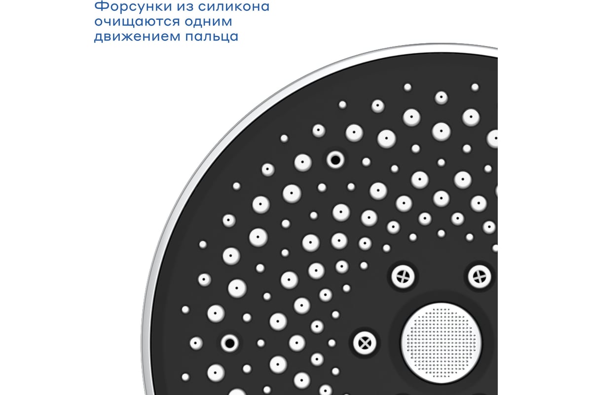 Стойкое хромированное покрытие лейки остаётся блестящим и не стирается со временем. Форсунки из силикона препятствуют образованию известкового налёта, не забиваются и очищаются движением руки.