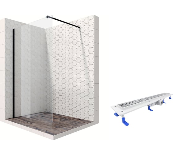 Душевая перегородка 100 см с трапом и свободным входом Ambassador Walk-in: душевая ширма 8 мм, профиль черный матовый, перегородка для душа стеклянная с защитой от разводов EasyClean 15031110-ST13