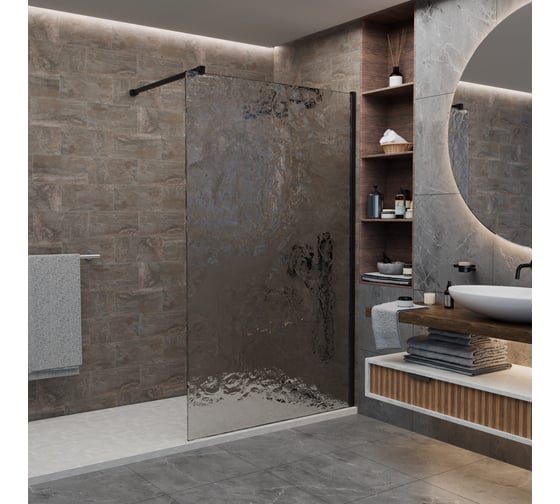 Модель воплощает идею единого пространства: перегородка не делит помещение, а мягко разграничивает его, сохраняя общую концепцию ванной комнаты.