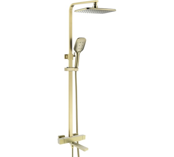 Свойства: Система относится к современному типу (тип 39), оснащена термостатическим смесителем с керамическим картриджем 35 мм и резьбовым подключением 1/2 по центру. Верхний душ квадратной формы, ручная лейка – круглая, выполнены из металла и пластика. Покрытие матовое, цвет – матовое золото (желтый), длина шланга 1500 мм. Конструкция без излива, предусмотрены необходимые элементы подключения.