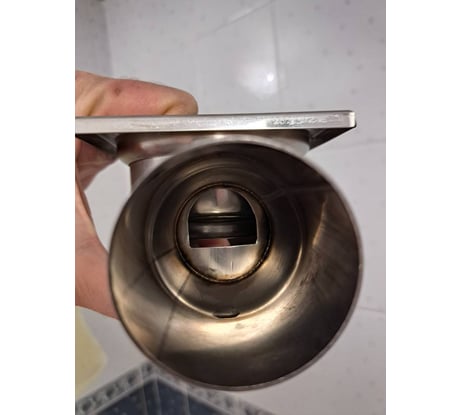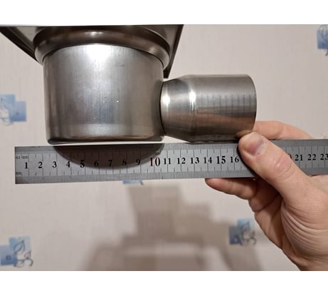 Гидрозатвор практически отсутствует, поскольку край чашки выше края сливного отверстия. Если налить воды, то формально вода закрывает проход воздуха, но только за счет поверхностного натяжения воды, она слегка касается края чашки. При малейших колебаниях давления в трубе этот миллиметр воды тут же высосет. Или просто высохнет за несколько часов. Остаётся надежда только на сухой затвор, но резинка круглая, а отверстие нет, насколько плотно будет прилегать неизвестно. Сварка вроде бы без пропусков, но настолько тонкий шов, что доверия не вызывает. Выпускной патрубок из 50мм переходит в 40, а потом ещё сужается раза в 1,5 из-за малого выпускного окна. В итоге пропускная способность маленькая, зачем было приваривать 50мм трубу не понятно. Кроме того приварена эта труба ниже края корпуса, монтажная глубина выходит уже больше 67мм, с надетой канализационной трубой и подавно.