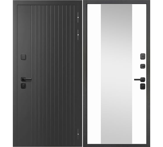 Внешняя панель в цвете «Графит» придаёт двери современный и строгий вид, гармонично сочетаясь с фасадом дома, а внутренняя отделка в белом матовом исполнении с зеркалом создаёт ощущение уюта и легко вписывается в интерьер.