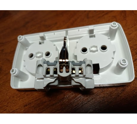 1)Нет перемычек между двумя розетками, соответственно долгий монтаж и изготовление перемычек. 2)Крепление на 2 самореза не сильно устойчивое и шатается при нажатии на корпус сверху или снизу(крепил на новую ламинированную фанеру, поэтому вопрос ровной стены не стоит)