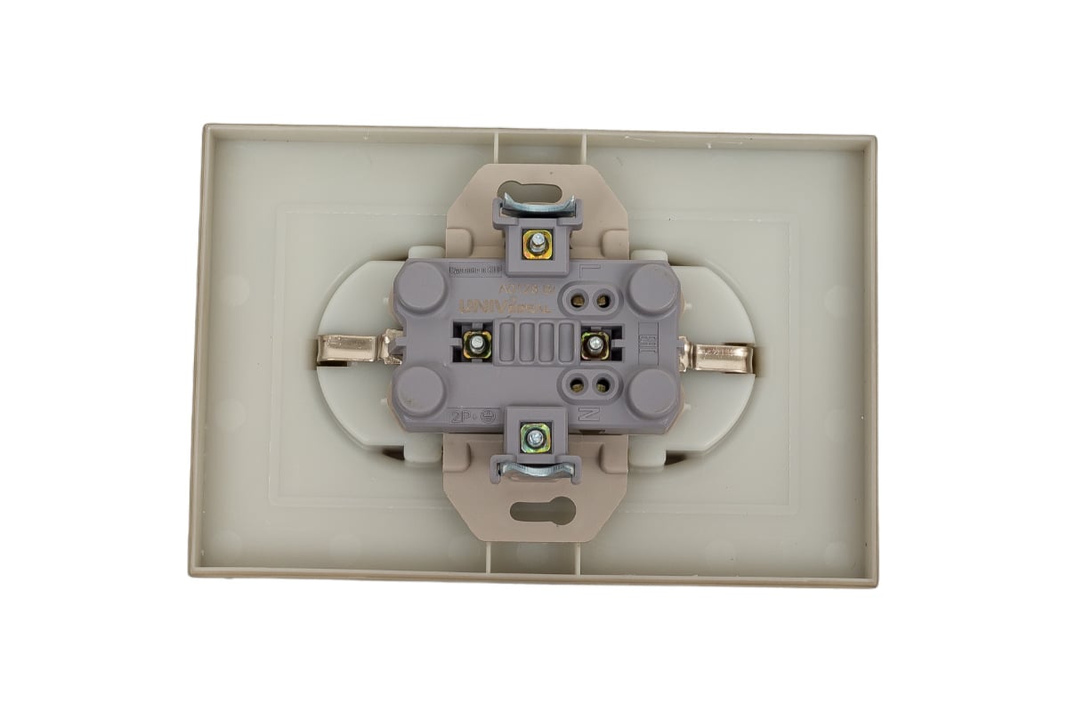 Двухместная розетка шампань UNIVersal серия Афина А0128-Br с заземляющими контактами, что значительно повышает уровень электробезопасности данного изделия.