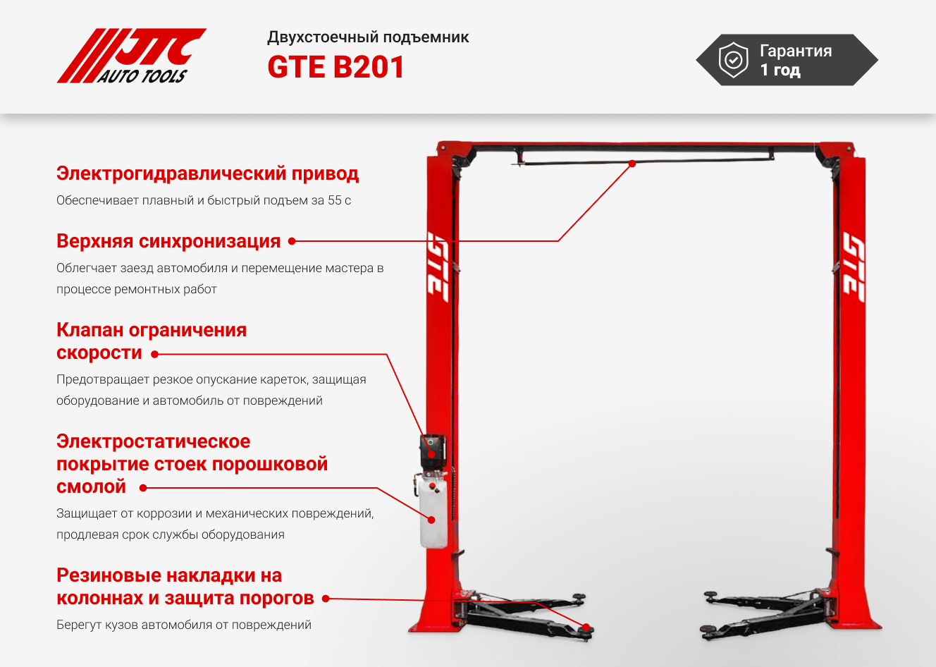 Двухстоечный подъемник GTE 4т с верхней синхронизацией, 220В (ручной двойной спуск) -B201 GTE-B201
