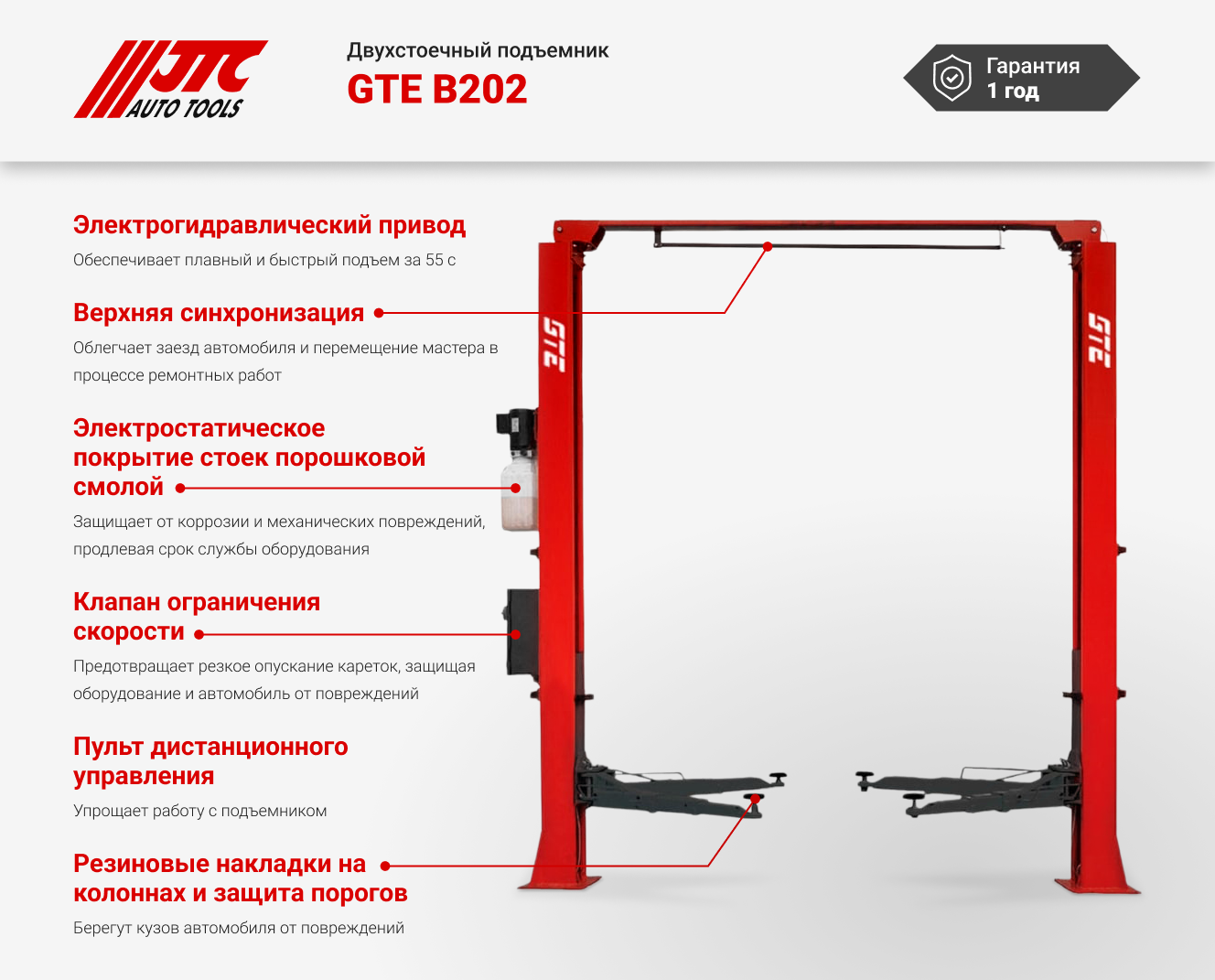 Двухстоечный подъемник GTE 4т с верхней синхронизацией, 380В (электрический спуск) -B202 GTE-B202