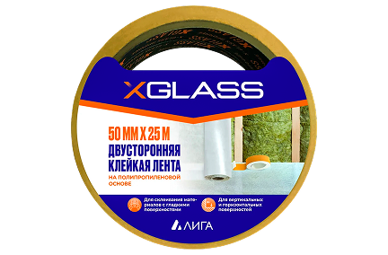 XGLASS Лента клейкая двухсторонняя Полипропилен 50мм х 25м, 160386 применяется на горизонтальных и вертикальных поверхностях, для склеивания гладких поверхностей и материалов при проведении монтажных, ремонтных, дизайнерских и оформительских работ. Подходит для монтажа легких предметов интерьера, в том числе деревянных реек на стену, пароизоляционных плёнок.