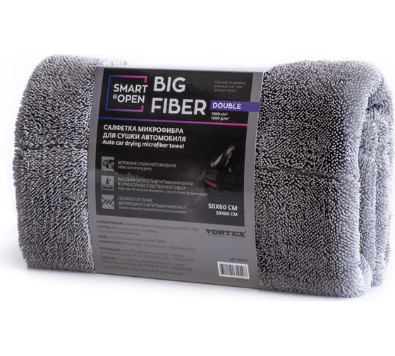 Двухсторонняя тряпка-микрофибра для авто Smart Open Big Fiber Double салфетка-полотенце для сушки 1200 г/м 50х60 160325 используется для бережной и максимально эффективной сушки любых поверхностей (без разводов и царапин).