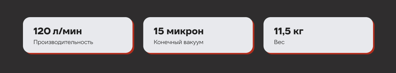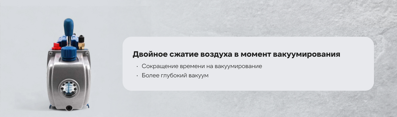 - Двухступенчатая конструкция позволяет достичь более глубокого вакуума и значительно сократить время вакуумирования, что делает процесс обслуживания систем более быстрым и эффективным.