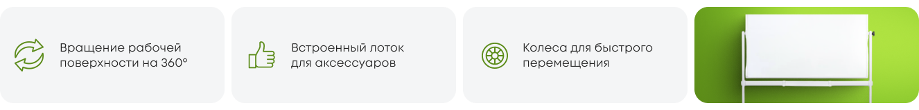 Отличный инструмент для организации информации на совещаниях. Доска устойчивая, вращение на 360° удобно для презентаций. Колесики облегчают перемещение.