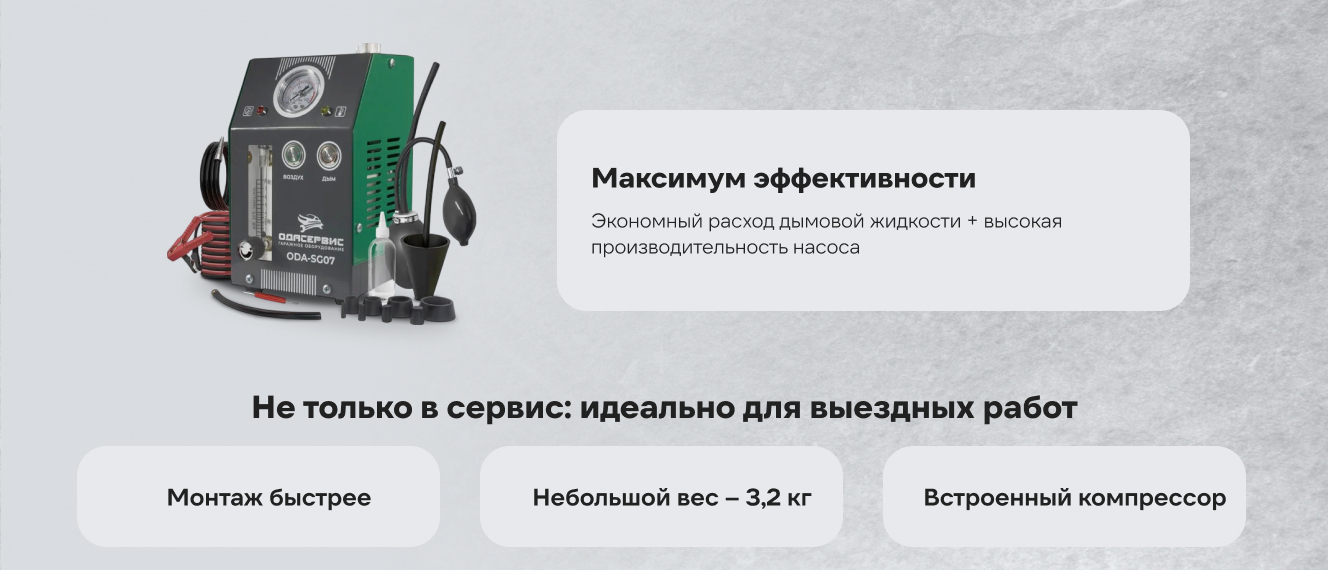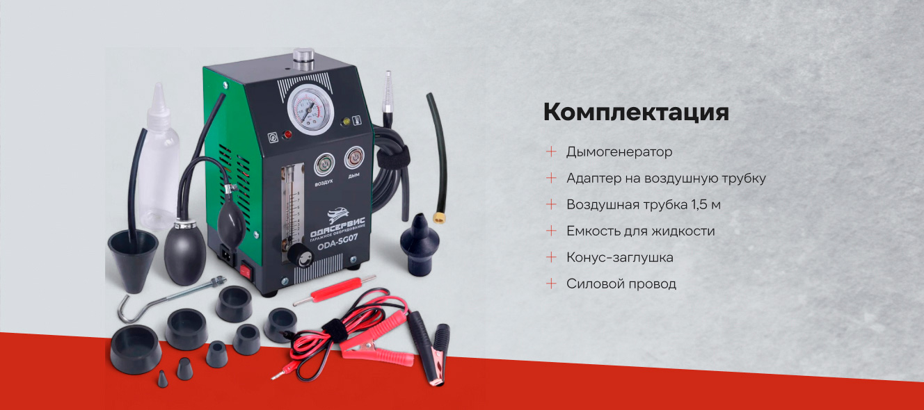 Дымогенератор ODA-SG07 со встроенным компрессором представляет собой легкий, компактный не требующий питания 220В прибор, имеющий два режима работы «Воздух» и «Дым» для оперативной диагностики автомобиля и эффективного обнаружения проблемы утечек «подсосов» воздуха в различных системах, требующих герметичность.