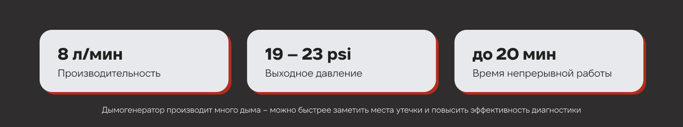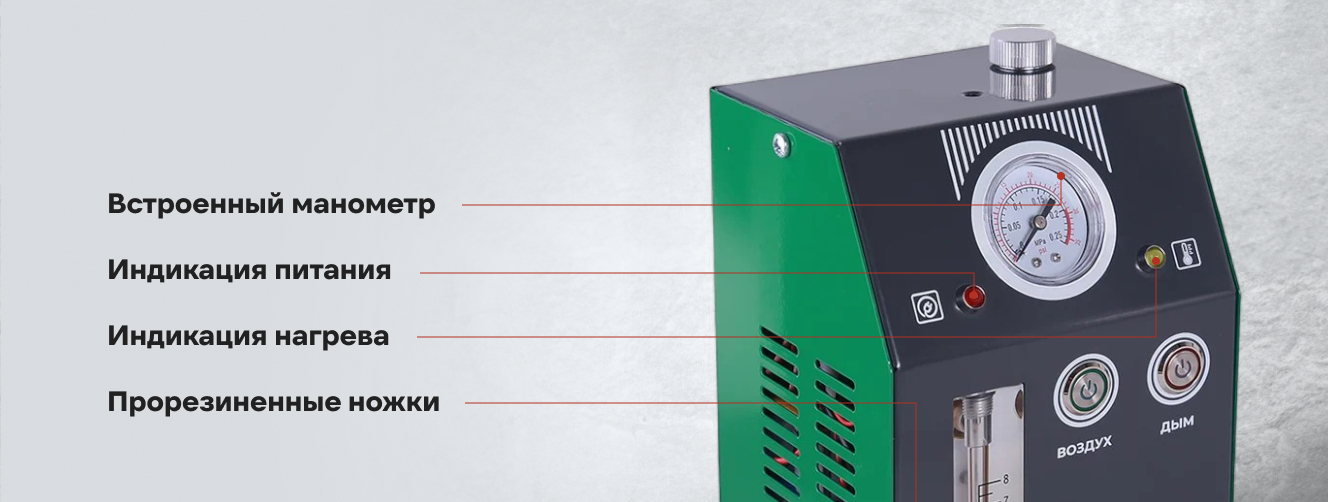 Дымогенератор прост в управлении и безопасен в использовании, имеет встроенный воздушный насос и два рабочих режима. Кроме того, имеет регулируемый расходомер воздуха, что позволяет более эффективно произвести диагностику.
