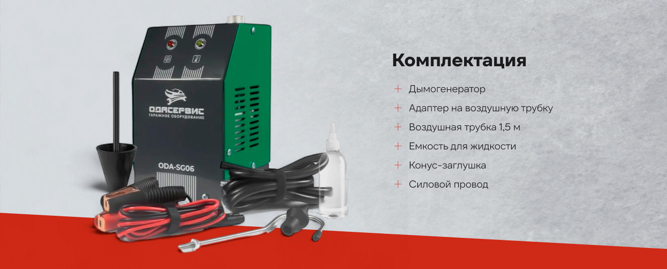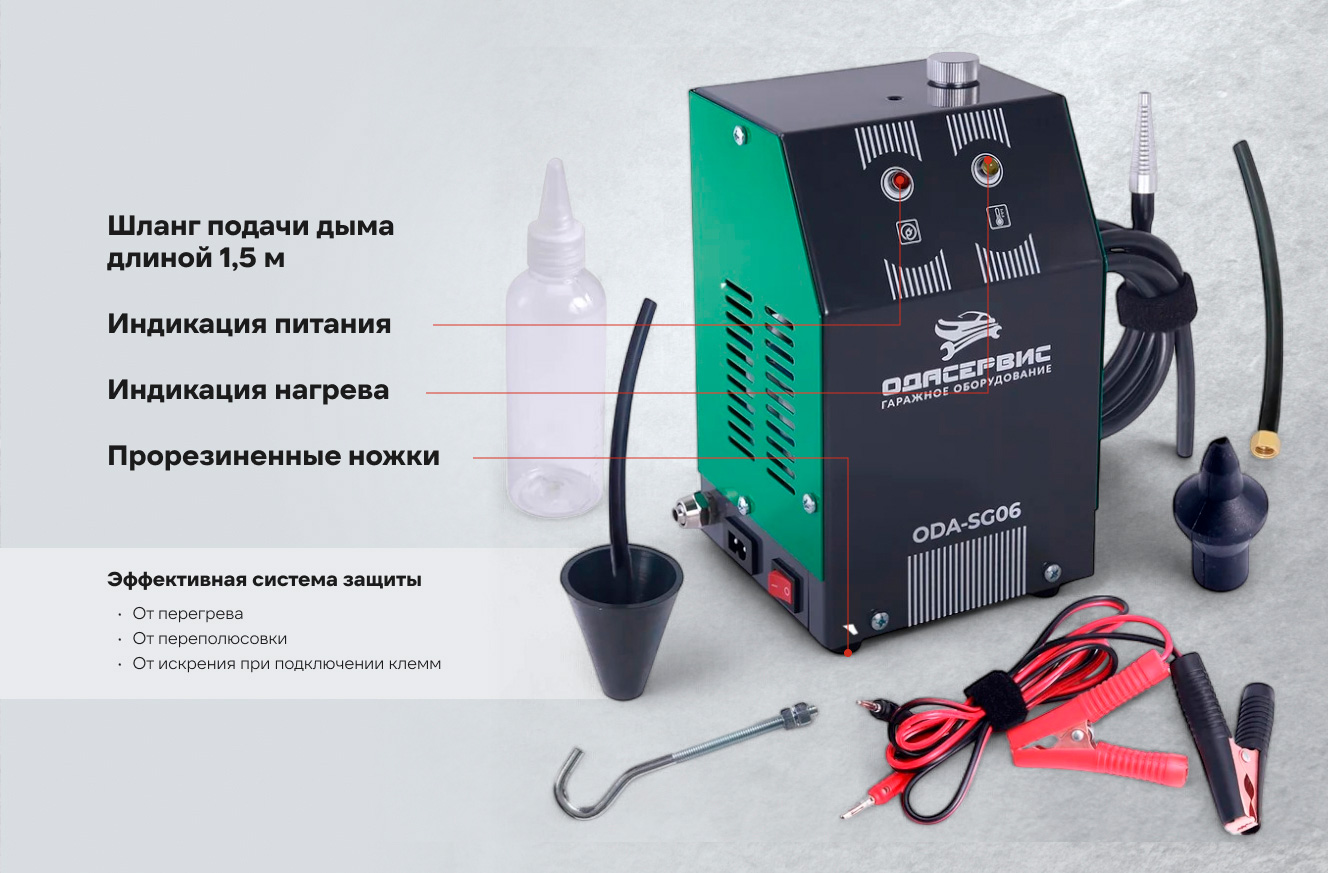Дымогенератор ODA-SG06 со встроенным компрессором представляет собой легкий, компактный не требующий питания 220В прибор, для оперативной диагностики автомобиля и эффективного обнаружения проблемы утечек «подсосов» воздуха в различных системах, требующих герметичность.