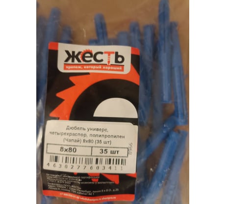 Дюбель универсальный четырехраспорный ЖЕСТЬ полипропилен, Чапай, 8x80 мм, 35 шт., пакет УТ-00008966