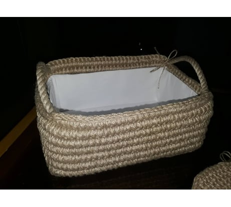 Вязание крючком корзин и других изделий из джута. Качество очень понравилось, получается жёсткий каркас, не сильно сыпится, нить ровная. Больше понравился, чем банковский. Брала оба шпагата в этом магазине. Рекомендую к покупке. Буду брать ещё.