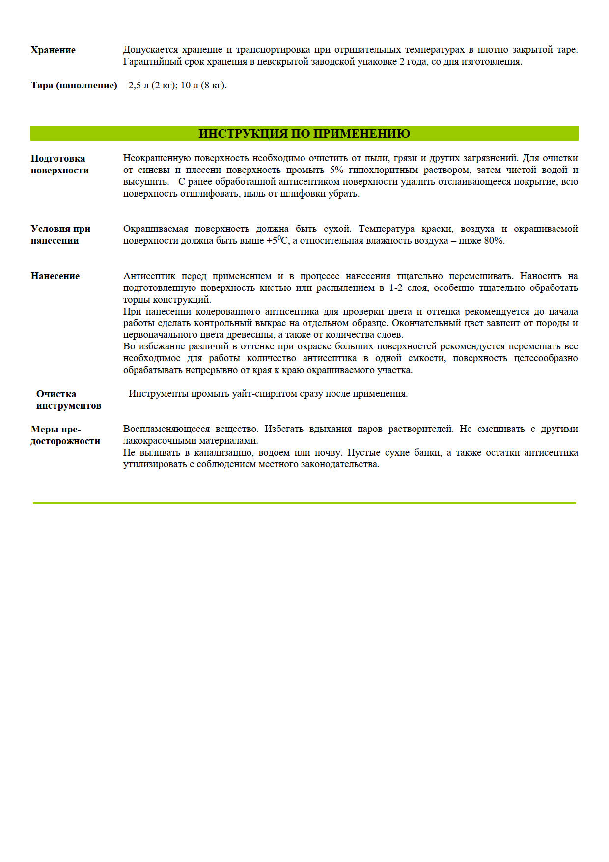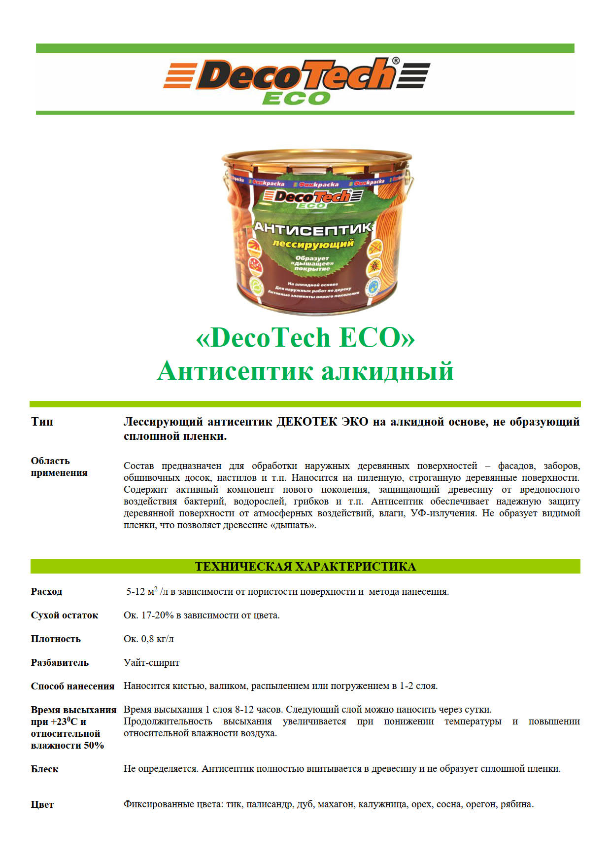 Антисептик предназначен для обработки наружных деревянных поверхностей – фасадов, заборов, обшивочных досок, настилов и т.п. Наносится на пиленную, строганную деревянные поверхности. Содержит активный компонент нового поколения, защищающий древесину от вредоносного воздействия бактерий, водорослей, грибков и т.п. Антисептик обеспечивает надежную защиту деревянной поверхности от атмосферных воздействий, влаги, УФ-излучения. Не образует видимой пленки, что позволяет древесине «дышать».