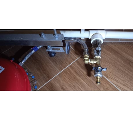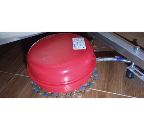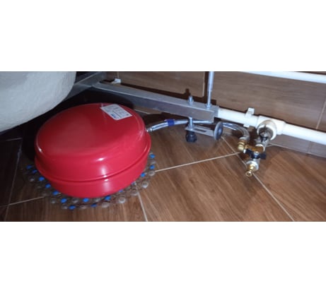 После того, как полетела мембрана встроенного расширительного бака газ. котла, по совету диллера установил дополнительный расширительный бак. Остановился вот на таком, 12 литровым, с очень удобной плоской формой. Установил на обратку и спрятал его под ванну, закрыл фартуком. Подсоединил гибкой подводкой на 3/4 50 см. Давление не прыгает, значит работает.