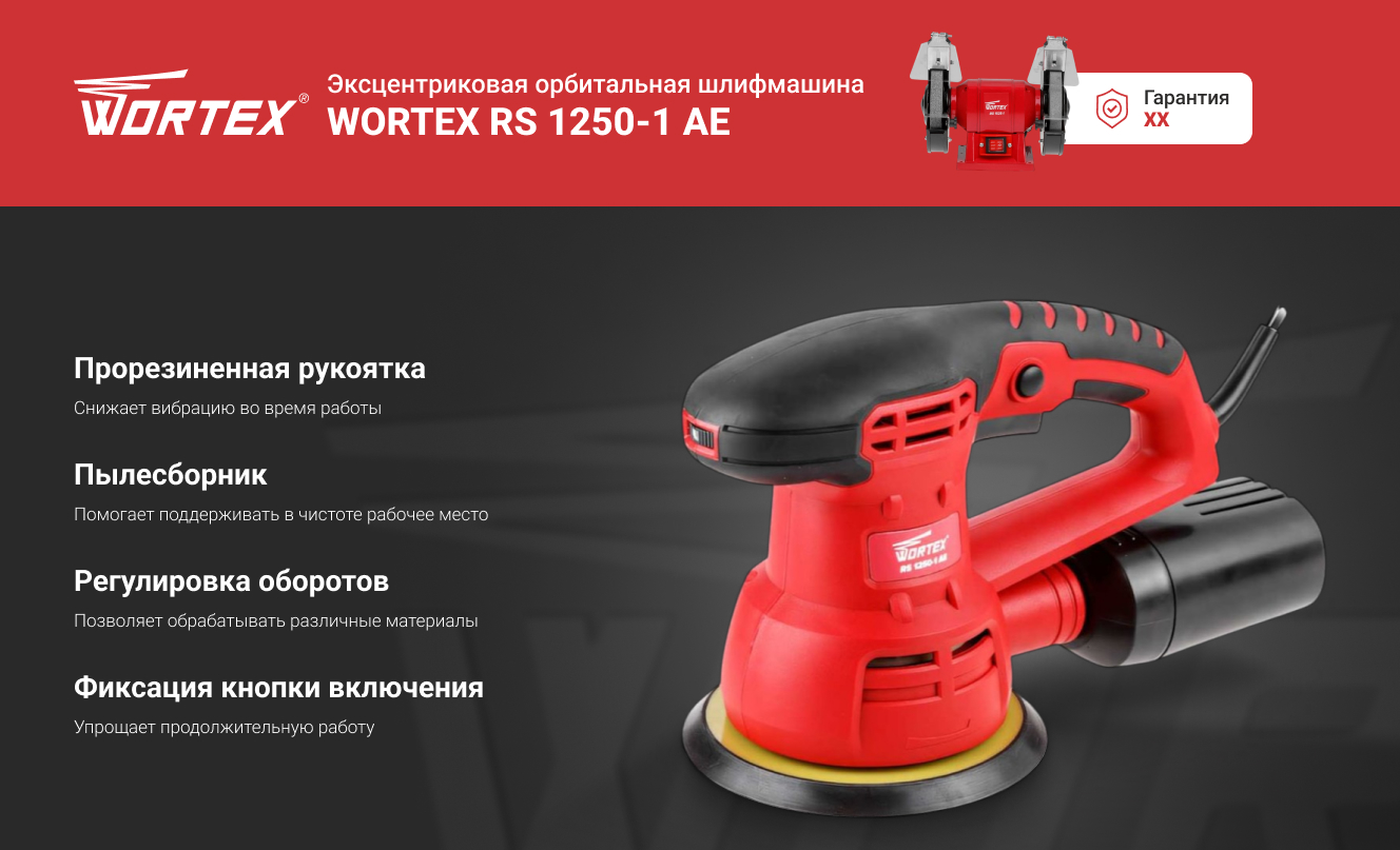 Эксцентриковая орбитальная шлифмашина WORTEX RS 1250-1 AE RS12501AE01319 – эргономичная конструкция с прорезиненными накладками для дополнительного удобства при работе.