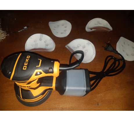 Первый раз пользую такой инструмент. Ну что сказать? Врукопашную 80 кв.м вагонки я бы шкурил до пенсии,а тут пару дней ушло. Наушники,респиратор и антивибрационные перчатки обязательно использовать. Приколхозил шланг от пылесоса и пыли в помещении нет совсем. Шнур коротковат,если работать под потолком,но это мелочь. В комплекте шел подарок из 36 кругов шлифовальных,плюс внутри такой же набор. Итого 72 круга,обшлифуйся. Итого :отличная шлифмашинка за свои деньги