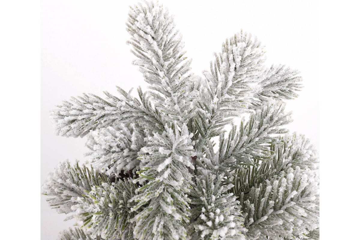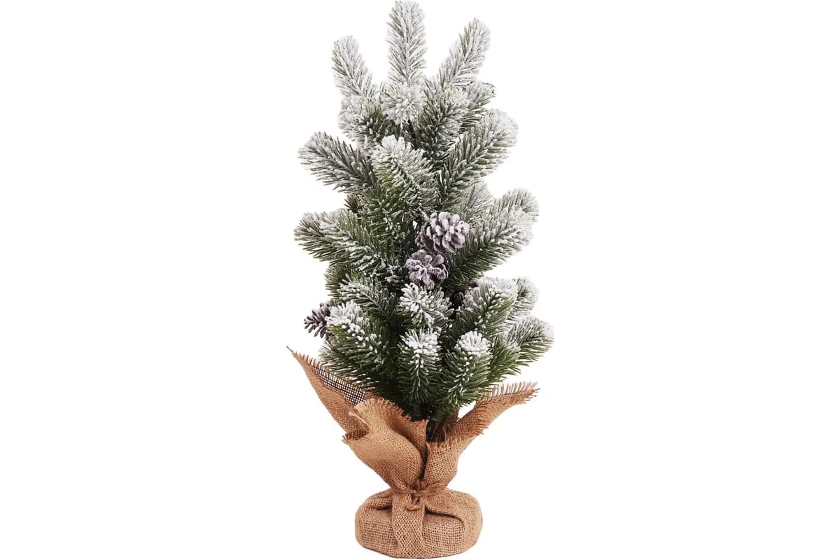 Ель искусственная настольная заснеженная с шишками высотой 50 см представляет собой конструкцию из металлического каркаса и закрепленных к нему ветвей.