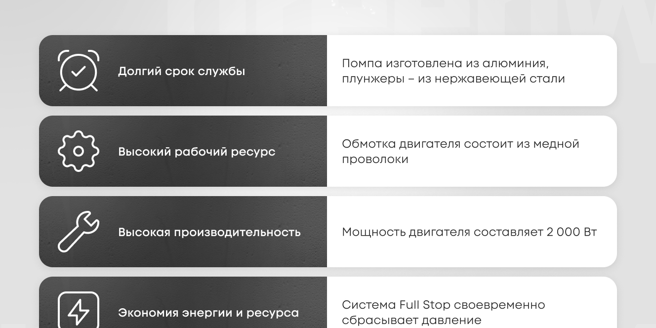 Мойка имеет компактные размеры и небольшой вес для комфортной транспортировки. Цилиндр помпы сделан из алюминия, а поршень из нержавеющей стали. Для удобного хранения оснастки на корпусе предусмотрен барабан для наматывания шланга, а сбоку корпуса можно хранить пистолет-распылитель. Также присутствует бачок для моющего средства.