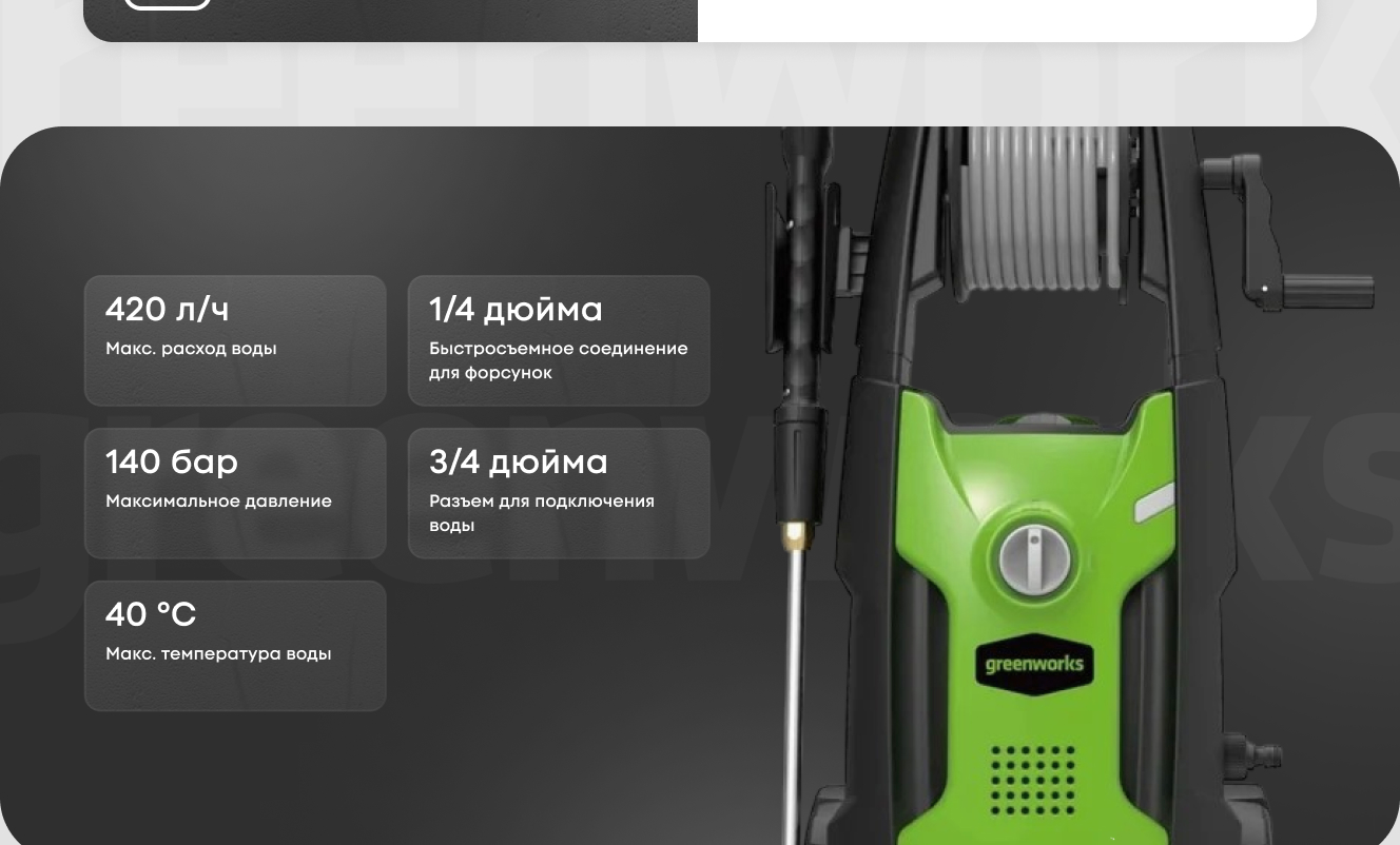 Ну в общем я сделал то что хотел и купил этот АВД - это мой четвертый АВД, до этого три АВД были марки Интерскол, но поскольку Интерскол любит кошмарить магазины инструментов и блогеров судебными исками, за негативные отзывы на свой инструмент (привет Папа Карло!), то это стало одним из решающих факторов в выборе АВД. Собственно почему я упомянул Интерскол? Потому что именно этот АВД прям реально напомнил мне модель Интерскол АМ-140/2000, именно с этой модели я узнал что оказывается есть бренд Greenworks. Но перейдем к сути... Самый основной и главный плюс который есть - это шланг. Шланг просто шикарный, потому что при около нулевых температурах не дубеет и имеет нормальную гибкость. Система сматывания шланга здесь явно лишняя т.к. шланг перегибается у основания штуцера - по итогу просто освободил его из катушки и оставил так как и есть. На шланге наконец то с двух сторон появились нормальные муфты на М22 х 1,5 - благодаря этому я прикупил отдельно короткий пистолет SG с поворотной муфтой у основания - после ее установки мойка автомобиля превратилось в одно удовольствие. Штатный пистолет тоже не плох, но для меня он через чур длинный. По соединениям насадок скажу что наконец-то прогресс добрался и сюда - здесь уже нормальные быстросъемы для смены насадок, за что производителю отдельный респект. По давлению сказать ничего не могу - штатное 105 бар, максимальное 140 бар. Но те кто моют автомобиль прекрасно знают, что основную работу по удалению грязи совершает не мойка, а химия, поэтому мне ее давления более чем достаточно. Штатный пенокомплект бесполезен и просвечивает насквозь - если внутри нет пенной таблетки (а ее там нет) то смысла пользоваться штатным пенокомплектом смысла нет. Отвечаю сразу на вопросы интересующихся людей - воду с бочки автомойка забирает! Само собой перед запуском шланг должен быть полностью заполнен водой, а бочка должна стоять выше уровня АВД. Резюмируя скажу, что данная автомойка это отличная тушка, к которой нужно прикупить отдельно нормальный пенокомплект под быстросъем, и короткий пистолет по желанию, и тогда данный АВД становится великолепным помощником в мойке автомобилей, а поскольку в семье их у меня три, то я знаю о чем говорю.