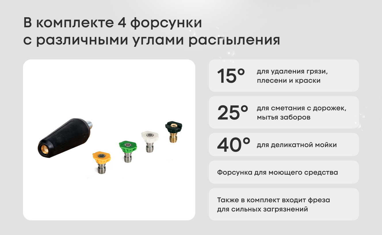 В комплекте профессиональный пистолет, удлинитель и насадка для моющего средства