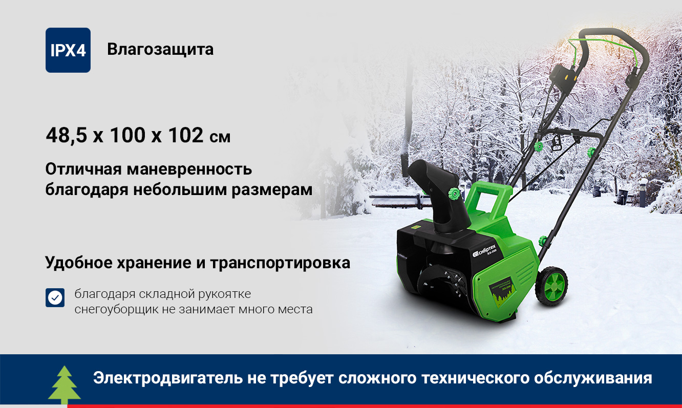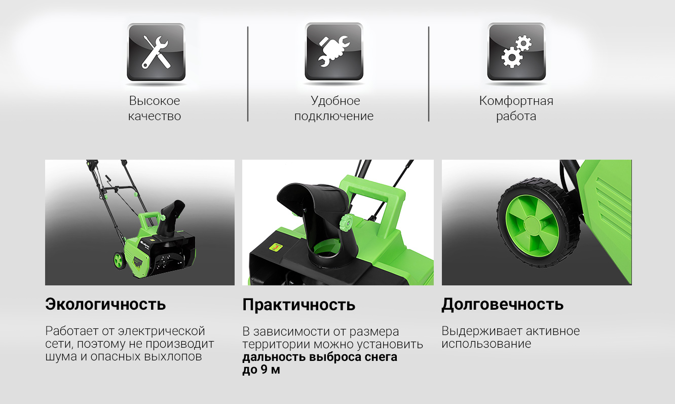 Удобство пользования Снегоуборщик оснащен колесами для более удобной транспортировки и эксплуатации. |