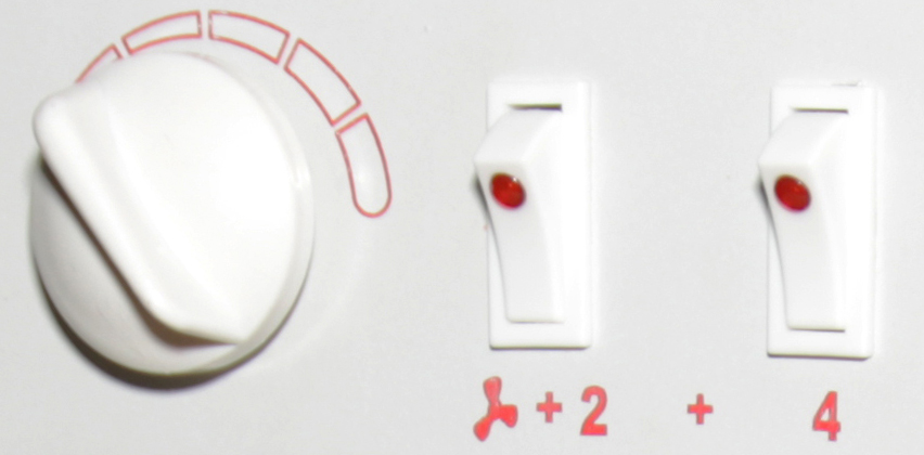 Простое управление Крайний левый переключатель — терморегулятор, средний переключатель — вкл./выкл. режима вентиляции + мощность 2кВт, крайний правый переключатель — вкл./выкл. увеличения мощности обогрева до 6кВт. |