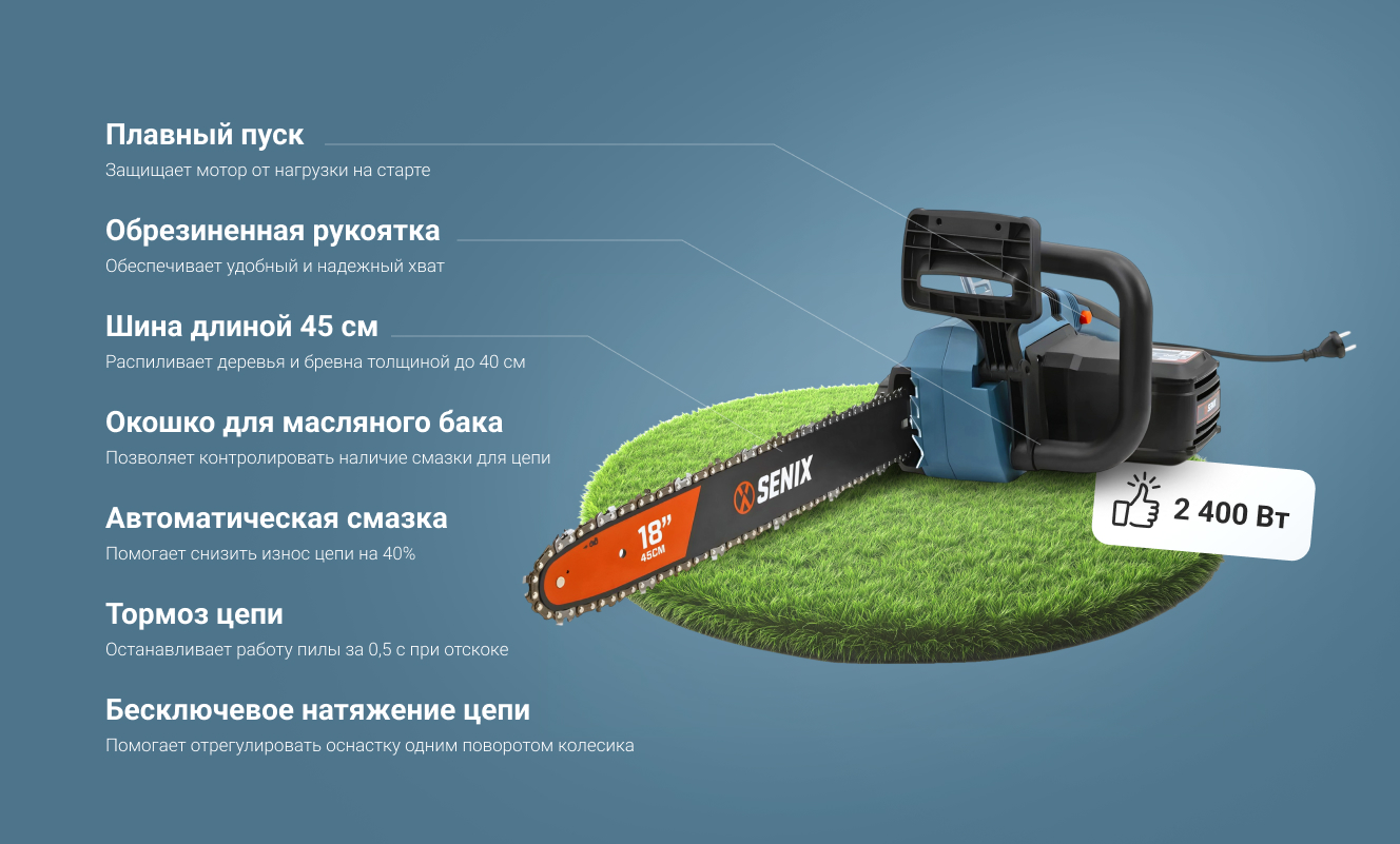 Срубить дерево, наколоть дрова или создать деревянную скульптуру? Легко! 2400 Вт мощности, шина 45 см и скорость цепи 15,2 м/с превратят любую задачу в удовольствие. Это не пила — это ваш личный лесоруб-виртуоз!