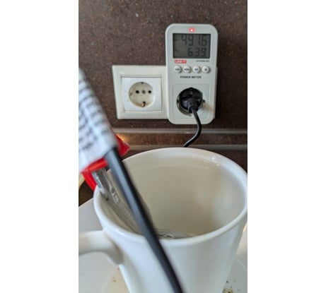Хороший кипятильник, мощность чуть меньше 500вт, кружка вскипает за ~3 мин