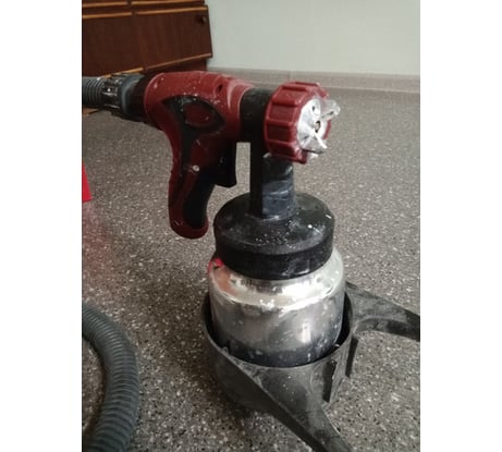 Для того, кто придумал комплектное уплотнительное кольцо между ёмкостью и пистолетом, в аду уже греют отдельный котёл. Первое наполнение ёмкости краской это колечко переживает. После того, как вы потратили первую партию краски и хотите налить вторую, с заводским кольцом нормально это сделать не получится, т.к. оно набирает в себя краску (проверено на грунтовке, водоэмульсионке и алкидной эмали), превращается в потрёпанное изделие номер 2, проваливается в банку и выполняет любую функцию, кроме основной - уплотнения. Без нормального уплотнения краскопульт будет делать всё что угодно, только не распылять краску. Поэтому, пожалуйста, если вы надумали его брать, в обязательном порядке дополнительно закажите кусок паронита 10х10 см и толщиной 2 мм. Я заказывал здесь же, на всех инструментах. Из паронита вырезайте прокладку и наслаждайтесь процессом. Резина не подойдёт, она также превращается в вышеупомянутое изделие, как и заводская прокладка. Размеры заводской прокладки: внешний диаметр 82 мм, диаметр внутреннего отверстия - 36 мм, толщина 3 мм. При покраске водоэмульсионкой на сопле и по бокам от него (откуда дует воздух) появляются наросты из засохшей краски, т.к. в процессе работы внутренности краскопульта нагреваются, а также прилично забиваются фильтры всасываемого воздуха. На выходе получается горячий воздух, который и высушивает подаваемую краску. С алкидной эмалью такой проблемы не было, но фильтры всё так же забивались. По шуму - для помещения достаточно громкий, по ощущениям примерно как фен для волос. Поэтому, если планируете долго им работать в помещении - защищайте ушки. На улице вполне себе можно и без защиты ушей обойтись, но тут уже личное дело каждого. Длина кабеля - если работать на уровне до 2 м, то приемлемо. Всё, что выше, или, если красить потолок - хотелось бы кабель на метр длиннее. Но этот момент терпимый. Вязкость красок - по ощущениям может распылять только "водичку-воличку", то есть очень жидкую краску. По опыту - грунтовка распылялась нормально без разведения, водоэмульсионку и алкидную эмаль пришлось бадяжить. Лучше под рукой иметь ёмкость с плотной крышкой и широким горлом как раз для разведения. При желании можно и комплектный вискозиметр использовать в этой ёмкости или в банке с краской, но, однажды намешав как надо по мурзилке, дальше вполне получится и на глаз нужную консистенцию приготовить. По обслуживанию - всё просто, после каждого применения снимайте всё, что можно снять и промывайте всё, что можно промыть. В особенности уделите внимание фильтрам всасываемого воздуха, они достаточно сильно забиваются краской. Возможно есть смысл купить рулон подобного материала, чтобы эти фильтры не мыть, а нарезать в размер готовые и просто менять по необходимости, т.к. после мытья родные фильтры деформируются, удлиняются и уже не так хорошо сидят на своих местах. По процессу покраски - в принципе всё нормально. Краскопульт умеет делать вертикальный и горизонтальный факел распыла, а также круглое пятно. Переключаются режимы поворотом черной пластиковой фиговины, из которой дует воздух. Объем подаваемой краски регулируется зазором между курком краскопульта и его корпусом - большой зазор - больше отходит игла - больше подаётся краски. И наоборот. Перед покраской приготовьте ненужный кусок чего-нибудь, на котором сможете о