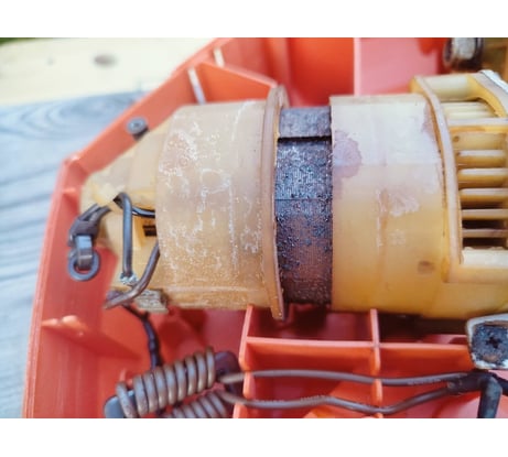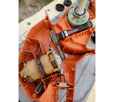 Конструкция грамотная, есть муфта сцепления (обгонная) на случай если камень или коряга заклинивает фрезы. Ременной привод на червякиот щеточного мотора. Вал червяка металлический, ведомая шестерня и полуоси из пластика с металлической вставкой. Фрезы стальные, ступица фрез со шлицами из пластика. И червяк и полуоси всё на нормальных подшипниках качения (по моему шариковые).
