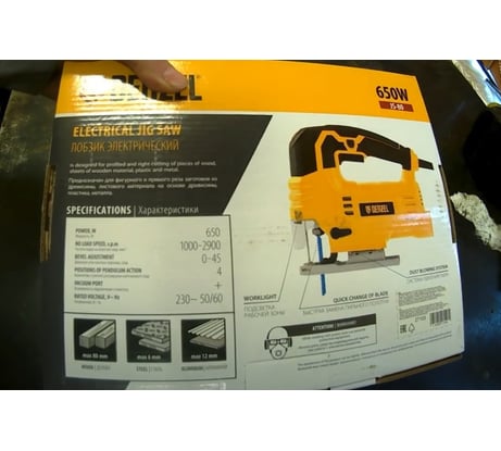 Двигатель мощностью 650 Вт обеспечивает частоту хода пильного полотна в диапазоне 1000-2900 ход/мин. Глубина пропила деревянных материалов составляет до 80 мм, материалов из цветных металлов — до 12 мм, а стальных — до 6 мм. Лобзик подключается к сети, поэтому работа не ограничена по времени.