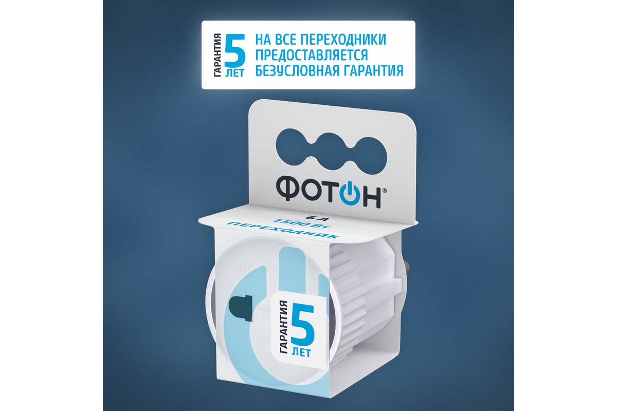 Переходник сетевой электрический ФОТОН – это переходник с 1 розеткой, предназначенный для возможности подключения электроприборов с евровилкой к розеткам российского стандарта. Рассчитан на подключение приборов мощностью до 1500 Вт (номинальный ток - 6А).