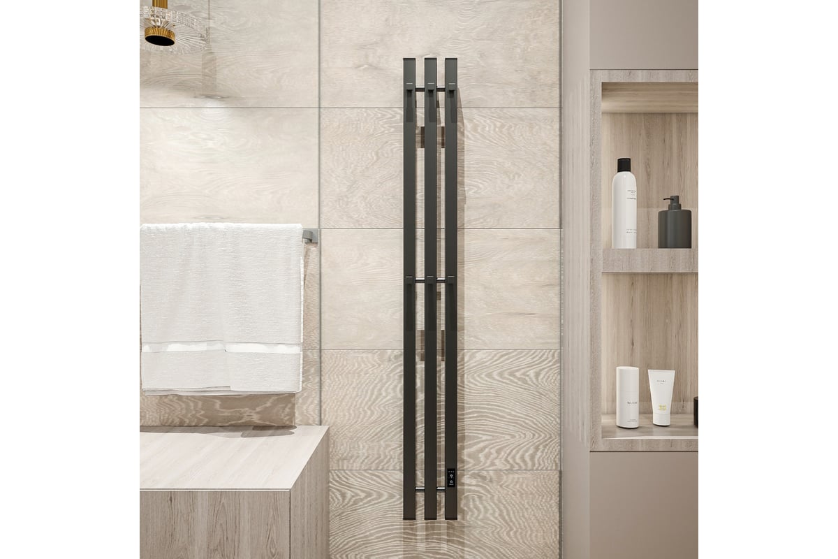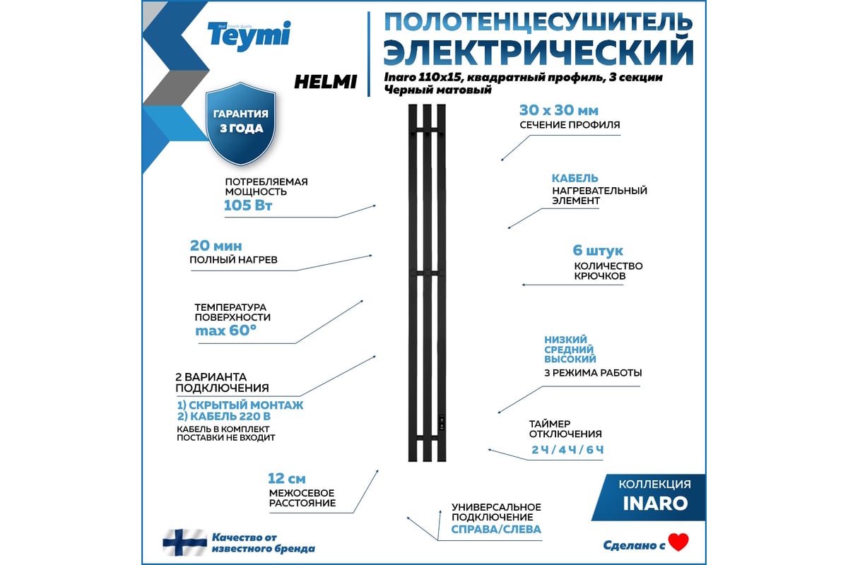 Электрический полотенцесушитель Teymi Helmi Inaro 110x15, квадратный профиль, 3 секции, с таймером, черный матовый E90121 ЦБ-00268970