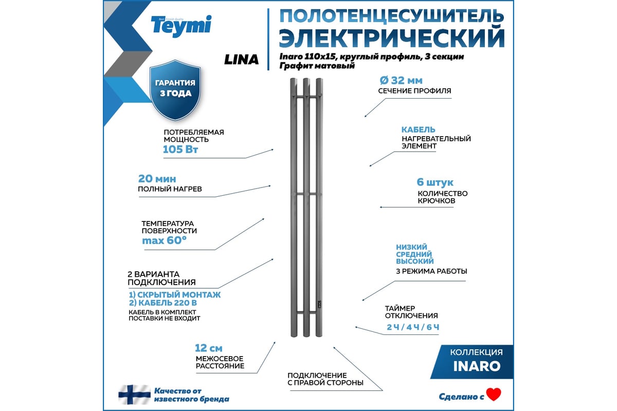 Электрический полотенцесушитель Teymi Lina Inaro 110x15, круглый профиль, 3 секции, с таймером, графит матовый E90118 ЦБ-00268977