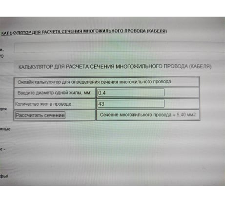 Провод состоит из 43 жил, диаметр жилы 0.4мм (по микрометру). При расчёте калькулятор выдаёт сечение 5.4мм вместо заявленных 6мм.