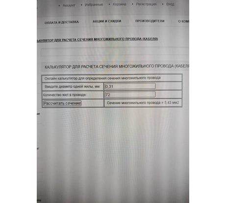 Провод состоит из 72 жил, диаметр жилы 0.31мм ( по микрометру). При расчёте сечения калькулятор выдаёт 5.43 мм вместо заявленных 6 мм.