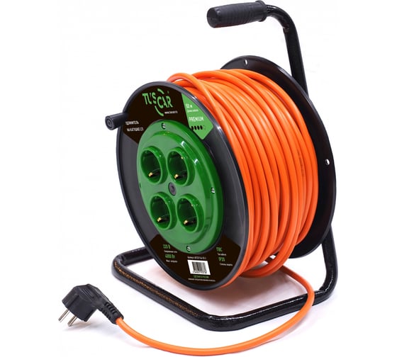 Электрический силовой удлинитель TUSCAR 50м, 4 розетки, на пласт. катушке, с/з пвс 3x2,5, 4квт 401331144-50-2