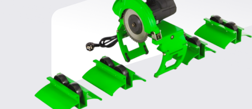 Особенность системы — модульные роликовые опоры: в комплекте 4 секции, каждая с двумя полиуретановыми роликами на подшипниках. Они устанавливаются вдоль рамы в зависимости от длины и диаметра трубы, обеспечивая ее центрирование, плавное вращение и предотвращая «биение» при резке. Это позволяет получать ровный, перпендикулярный срез без сколов — критически важно для последующей сварки или герметичного соединения.