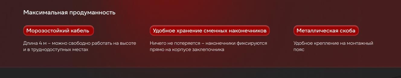 Заклепочник оснащён усиленным мотором мощностью 500 Вт, двойным редуктором и зубчатой муфтой, обеспечивающей стабильную тягу даже при длительной нагрузке. Нами были модернизированы ключевые узлы и механизмы, увеличив их ресурс и устойчивость к нагрузкам. Скорость установки стальной заклепки 4.8х12 = ~0.7 секунды с учетом выброса хвостовика.