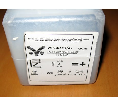 Первые мои электроды, про которые хочется сказать: "Покажите как ими варить!". С привычными 13/55 разница гигантская: как будто от "рутила" взяли океан шлака(диаметр электрода "двойки" аж 3.8мм, а у 13/55 - 3.2мм), а от основных - необходимость чётко держать короткую дугу, последнее усложняется тем, что козырёк у электрода образуется воистину огромный - стержень электрода буквально где-то ТАМ, в "норе" :-) Плюс, как мне показалось, легче чем на 13/55 "утопить" электрод в сварочной ванне, погасив дугу. Рабочий диапазон тОков какой-то не очень большой получается, на низком токе электрод вяло горит и дуга не откидывает шлак, на высоком - электрод горит слишком резво, дуга легко рвётся("двоечку" 13/55 что от МЭЗ, что от СЗСМ контролировать несравненно легче). Диапазон, в котором электрод приятно горит, буквально 5-10 ампер. Для бОльших диаметров сварка опиранием поди вполне рабочий метод. Шлаковая корка у основания шва отходит плохо, для удаления обойтись ленивым елозиньем молотка не получится. Брал эти электроды(тип Э42А) в надежде, что сварочные швы будут чуть легче обрабатываться в сравнении с 13/55(да-да, кто плохо варит, тот хорошо шлифует), а видимость сварочной ванны будет такая же как у других электродов с основным покрытием...по обоим пунктам "пролёт". В общем, если и брать эти 13/45, то четко нужно знать зачем вам эта марка электродов нужна. Упаковку вряд ли можно назвать 100% герметичной(просто пластиковый бокс, по стыку закрученный скотчем), поэтому если нет возможности прокалить(1ч при 380гр), то и покупать скорее всего эту большую пачку не стоит. Моя пачка электродов где-то болталась больше двух лет до момента покупки.