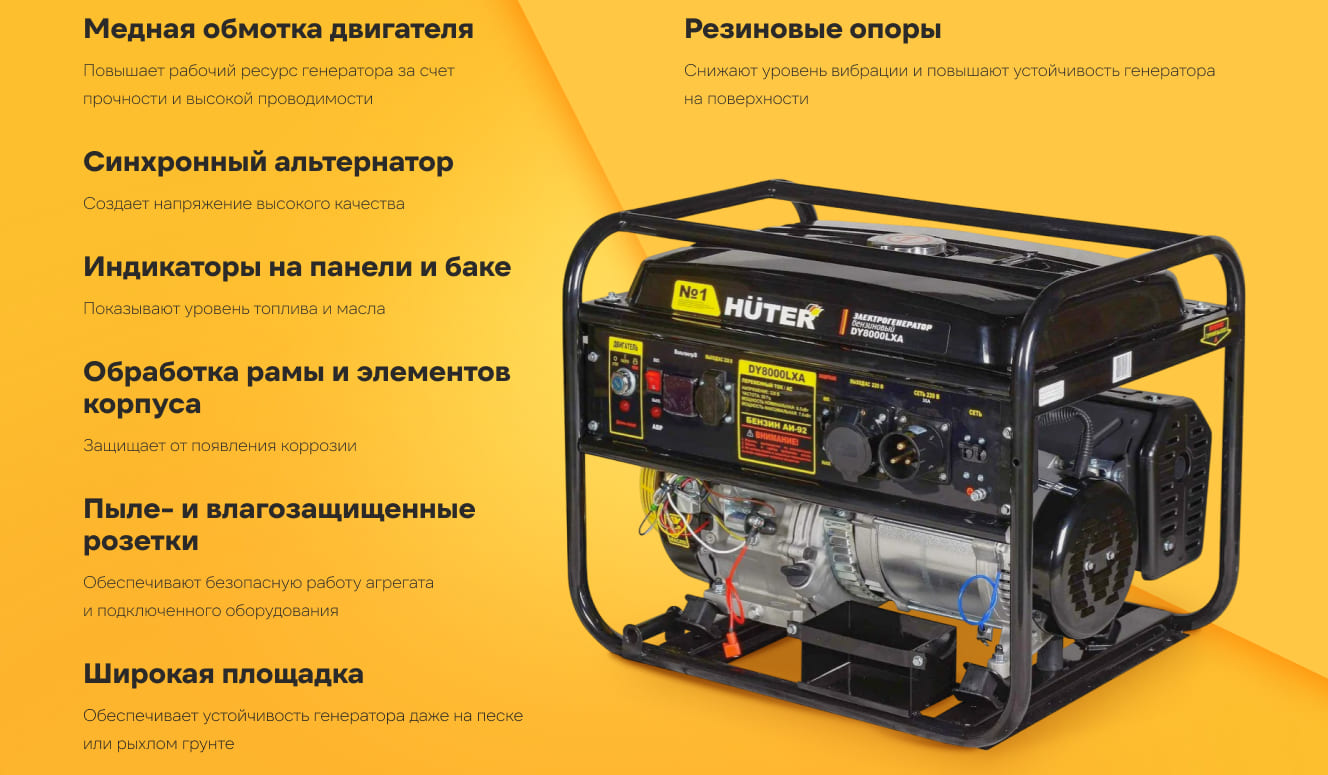 HUTER DY8000LXA — портативное устройство, которое обеспечит электроснабжение вашего дома или рабочего помещения во время аварийных отключений на сетях. За счет автономности оборудование можно использовать в полевых условиях для подключения инструмента при проведении строительных и ремонтных работ.