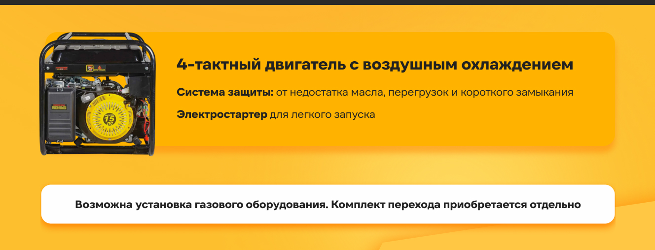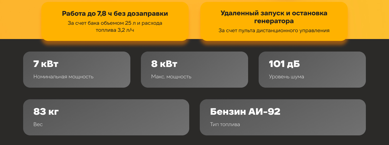 Электрогенератор развивает мощность до 7000 Вт и выдает напряжение 220 В. Для автоматического ввода в работу генератора, например при отключении света, встроен блок автоматики АВР. Оснащен четырехтактным одноцилиндровым бензиновым двигателем мощностью 15 л.с. с воздушным типом охлаждения. Для заправки бака объемом 25 л используется бензин марки АИ-92. Расход составляет 375 г/кВт*ч, что позволяет использовать прибор в течение 8 часов. При установке газового оборудования генератор может работать на пропане или смеси пропан-бутана. Для смазывания частей двигателя используется моторное масло SAE 10W-40 API: SL, SJ, SF. Емкость для смазки вмещает 1.1 л, при недостаточном уровне масла сработает защита и двигатель не запустится.