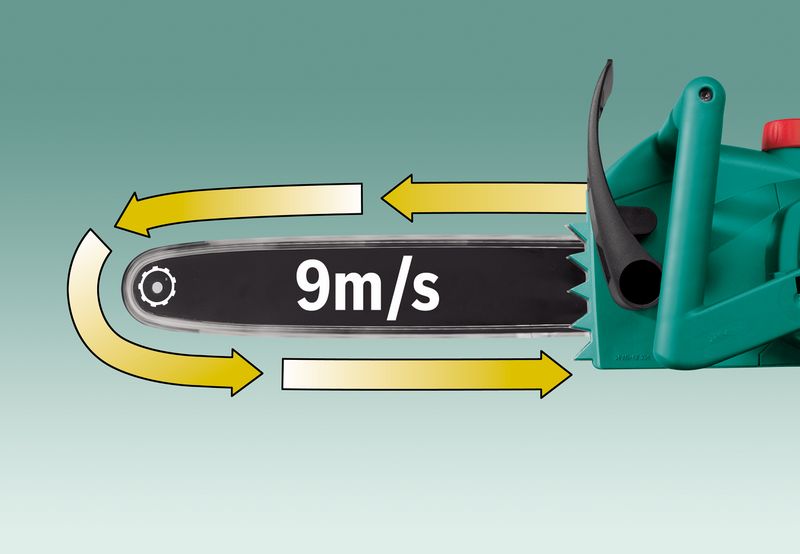 Высокая скорость Скорость движения цепи электропилы составляет 9 м/с, что обеспечивает высокую производительность и точность реза. |
